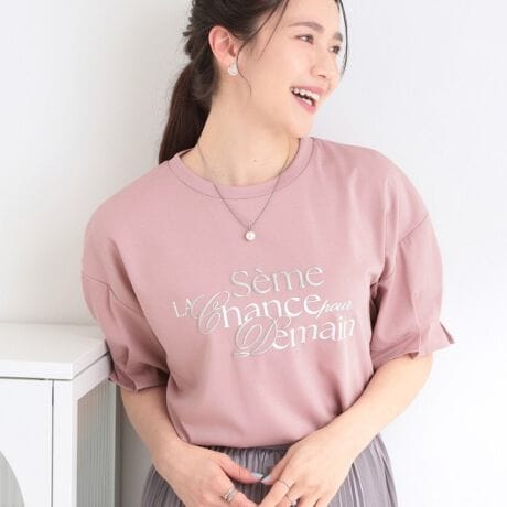 メッセージロゴがエレガントなフォントでプリントされ、ラメ入りの発泡プリントでシンプルながらも表情のあるデザインに仕上がっています。