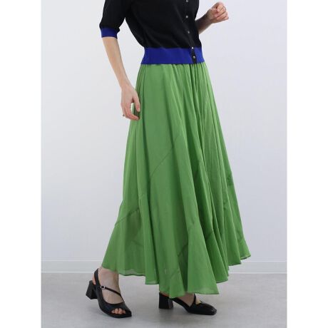 軽やかに揺れるシルエットが印象的なロングスカート。さりげない足元の透け感が軽やかさをプラス。たっぷりと分量を持たせたデザインが、動くたびに美しく広がり女性らしい印象を演出します。色鮮やかなグリーンやブルーを含んだ、豊富な4色展開。シンプルなデザインでスタイリングに馴染みやすく、おでかけスタイルから夏のリゾートスタイルにもおすすめの万能スカートです。