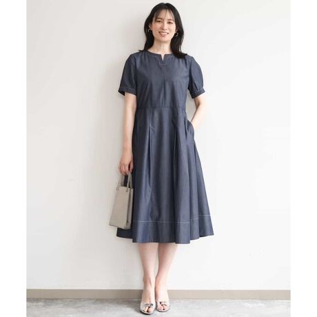 昨年好評だったデニム風素材で仕立てたワンピース。女性らしいフィット&フレアシルエットに、涼しげなキーネックデザインが印象的な一枚です。配色ステッチがさりげないアクセントに。ウエスト部分の切り替えとタックが自然にお腹まわりをカバーし、すっきりとした印象に仕上げました。