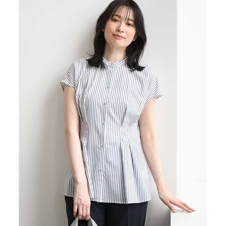 アクセントの効いたストライプ柄が印象的なブラウス。ウエスト部分にタックを入れ、すっきりと細見えするシルエットに仕上げました。ヒップがやや隠れる丈感で、気になる腰まわりも自然にカバー。フロントには小さなメタルボタンを使用し、すっきりとした上品な印象に仕上げています。
