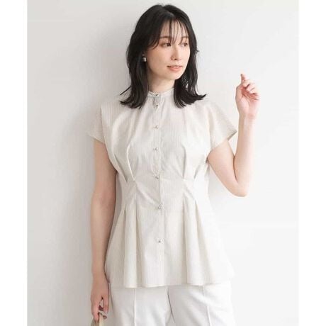 アクセントの効いたストライプ柄が印象的なブラウス。ウエスト部分にタックを入れ、すっきりと細見えするシルエットに仕上げました。ヒップがやや隠れる丈感で、気になる腰まわりも自然にカバー。フロントには小さなメタルボタンを使用し、すっきりとした上品な印象に仕上げています。