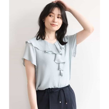 フロントにあしらったフリルが華やかな印象のブラウス。羽織りを合わせてもフリルが見えるデザインで、コーディネートのアクセントになります。首元はすっきりと見えるVネックに仕上げ、女性らしい軽やかな雰囲気に。シンプルながら一枚でも着映えするデザインです。