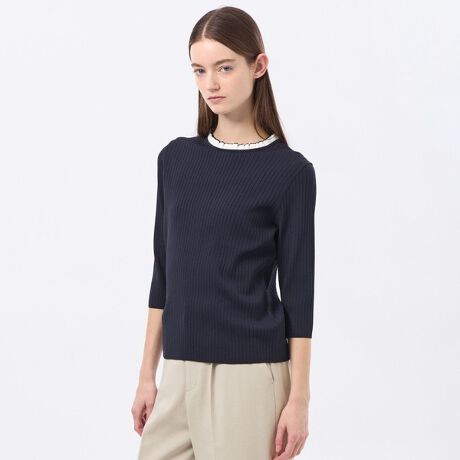 フリル襟がデザインポイントの7分袖プルオーバー。リブ組織のスッキリとしたシルエットで様々なボトムスと好相性です。