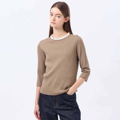フリル襟がデザインポイントの7分袖プルオーバー。リブ組織のスッキリとしたシルエットで様々なボトムスと好相性です。
