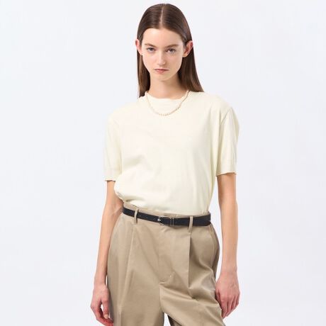 ニットの上品さとカットソーの軽快さを兼ね備えたクルーネック半袖プルオーバー。一着あるだけでコーディネートの幅が広がるニットソーです。ニットと同様に袖口や裾のリブ部分から身頃に向かって編み続きで、異なる組織に変化しながら編み上げることができるため、リブ部分は継ぎ目も無く、すっきりとフラットに仕上がっているのが特徴です。シンプルなのでボトムを選ばず着やすい一枚です。カジュアルなアイテムとコーディネートしても上品で大人な雰囲気にまとまります。