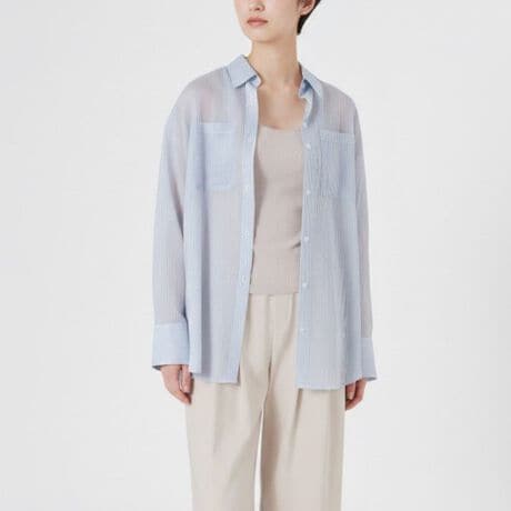 繊細なシアーストライプが映える、軽やかで涼しげな素材。ほど良い透け感と上品できれいなカラー展開で清潔感と抜け感をプラス。オン・オフ問わず取り入れやすく、デイリーに活躍します。