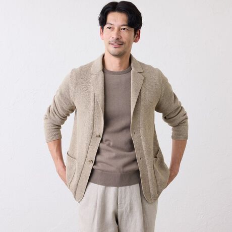 Tシャツやポロシャツに羽織るだけで上品に見えるように立体的な編立設計に拘りました。