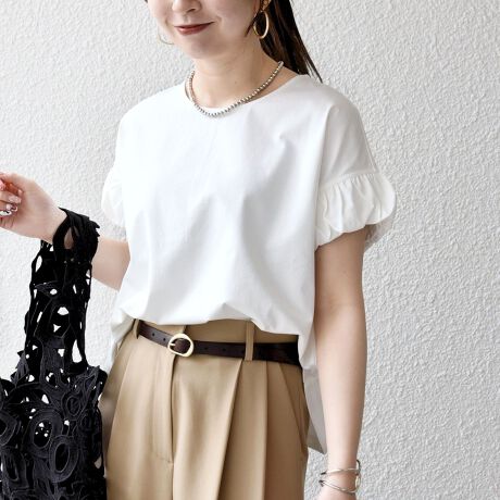 袖にはギャザーが施されており、Tシャツのラフさを残しつつフェミニンな印象に見せてくれます。