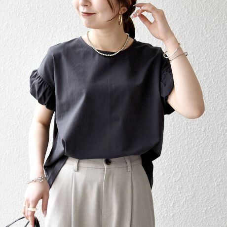 袖にはギャザーが施されており、Tシャツのラフさを残しつつフェミニンな印象に見せてくれます。