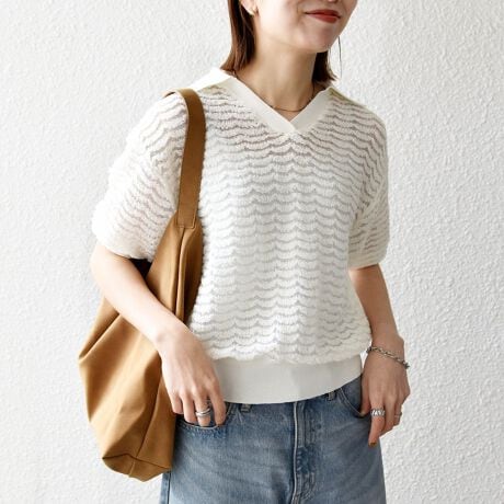 《予約》SHIPS any:〈手洗い可能〉シアー ジャカード スキッパー ポロ ニット