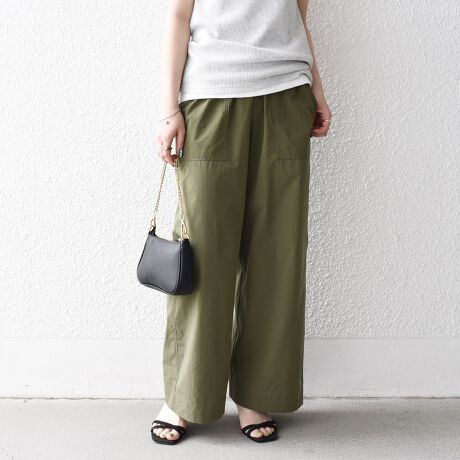 張りのある素材感ながら、ウエストは総ゴムで楽な穿き心地のイージーパンツ仕様。