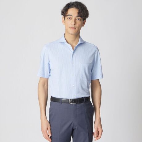 ニット組織でサッカー生地のような雰囲気を持ったストライプ素材を使用した、ニットサッカーシャツ。