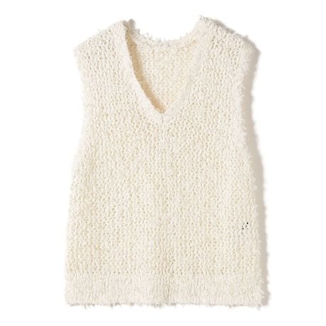 チュールテープを引きそろえた、表情豊かな編地が目を惹くニットベスト。