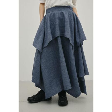 モデル身長163cm(Mサイズ着用)まるで四角い布を重ねたような、構築的なパターンにこだわったレイヤードフレアスカート。2段ティアードデザインが生み出す奥行きと立体感で、動くたびに美しく揺れる一枚です。直線的なカッティングとフレアの柔らかさを掛け合わせ、甘くなりすぎないモードな印象に仕上げました。シンプルなトップスを合わせるだけで、洗練されたスタイリングが完成。ウエストまわりはすっきりと、裾に向かって広がるシルエットでバランスよく着用可能。デイリーからお出かけまで幅広く活躍します。ストレッチなし、透け感なし。【お手入れ方法】マシンウォッシュ可