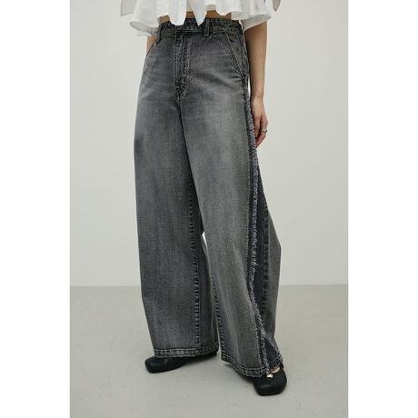 モデル身長163cm(Mサイズ着用)パネルごとにカラー差をつけた、立体感のあるリメイク風デザインが魅力のワイドデニム。異なるトーンを組み合わせることで奥行きが生まれ、こなれた印象に導きます。サイドにはフリンジディテールを施し、動くたびにさりげないアクセントをプラス。ゆったりとしたワイドシルエットで身体のラインを拾いにくく、トレンド感と快適さを両立しています。シンプルなTシャツ合わせでもコーデが完成する主役級アイテムです。ストレッチなし、透け感無し。【お手入れ方法】マシンウォッシュ可