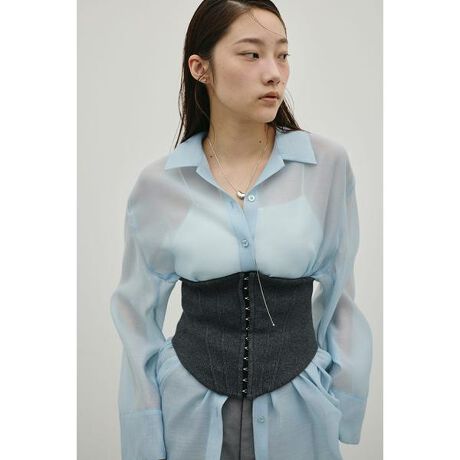 [型番:500JSR80-2781]モデル身長163cm(Mサイズ着用)リブカット素材のコルセットビスチェ。程よいシェイプラインで身体になじみやすく、カジュアルなスタイリングにも女性らしいニュアンスを取り入れられる一枚。後ろはシャーリングゴムを入れて、厚手のカットーやシャツも重ねやすい仕様になっています。透け感なし、ストレッチなし。【お手入れ方法】手洗い可