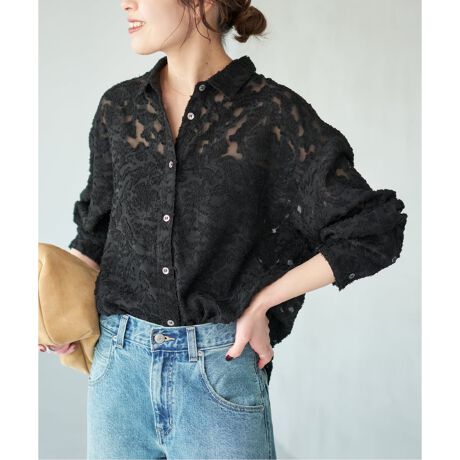 シアー感がありながらも、部分的にジャガードを施すことで透けすぎず、上品な印象に仕上げています。
