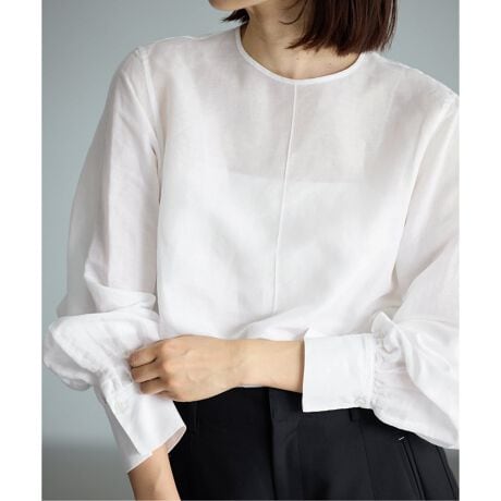 デザインはノーカラーのコンパクトなブラウス。