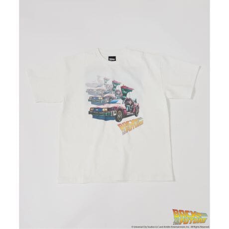 ・ホワイト(デロリアン): フロントには残像のように幾重にも重なるデロリアンのアートワークを配置。バックには「TIME MACHINE」のレターとともに、トレーラーから姿を現す名シーンをプリント。