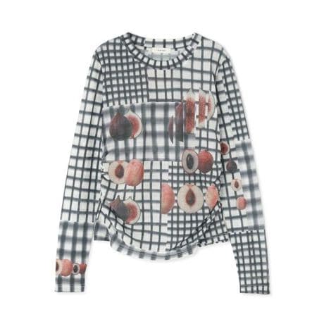 チェックとフルーツのグラフィックを、シアー素材に落とし込んだトップス。
