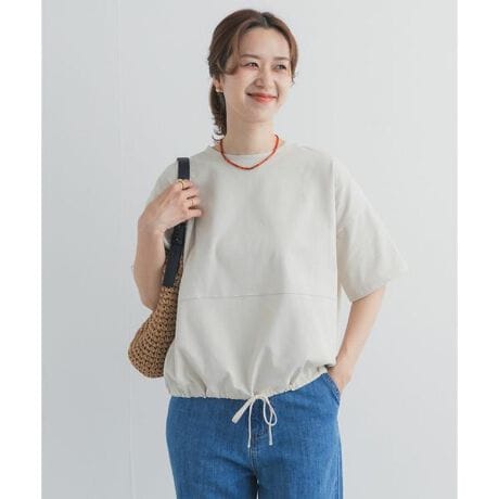 裾にドロスト紐をあしらったプルオーバーカットソーは、リボンでシルエットの調節ができるデザイン。