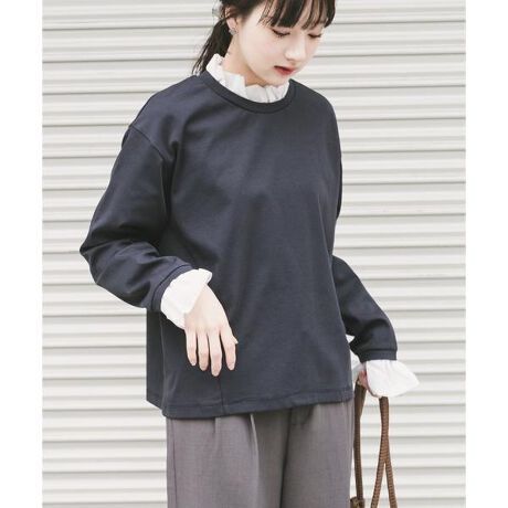 首元と袖口にあしらった繊細なピコフリルがポイントのプルオーバーは、まるでブラウスをレイヤードしたような着こなしが一枚で叶う優秀アイテム。甘さを程よく抑えたデザインで、大人でも取り入れやすいバランスに仕上げています。フロントの切り替えラインがさりげなくスタイルをすっきり見せ、前後差のある丈感とサイドスリットでボトムを選ばず着回しやすいのも魅力。カジュアルな着心地ながら、顔まわりと手元に華やかさをプラスしてくれるので、オンオフ問わず活躍する一枚です。