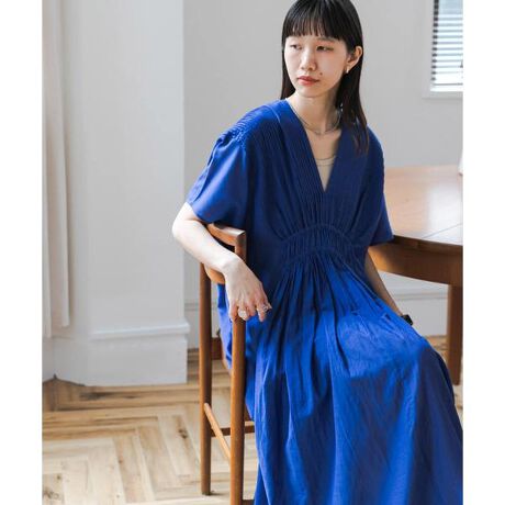 インドのレーヨンコットンの少しつやっぽいボイル素材を使用した、Vネックギャザーワンピース。