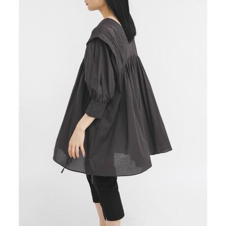少しシアー感のあるドライタッチな綿素材にレースをドッキングしたミニワンピース。甘くなり過ぎない印象のメッシュ状のレースと、ハシゴレース、ピンタックをMIXさせました。前後2WAYの着用が可能で、ふんわりとしたシルエットは体型カバーも期待できます。袖口は内側にスリットと、釦開き仕様になっているので締め付け感がないです。軽やか且つ涼し気な印象なので春夏におすすめのアイテムです。
