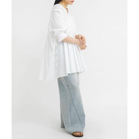 少しシアー感のあるドライタッチな綿素材にレースをドッキングしたミニワンピース。甘くなり過ぎない印象のメッシュ状のレースと、ハシゴレース、ピンタックをMIXさせました。前後2WAYの着用が可能で、ふんわりとしたシルエットは体型カバーも期待できます。袖口は内側にスリットと、釦開き仕様になっているので締め付け感がないです。軽やか且つ涼し気な印象なので春夏におすすめのアイテムです。