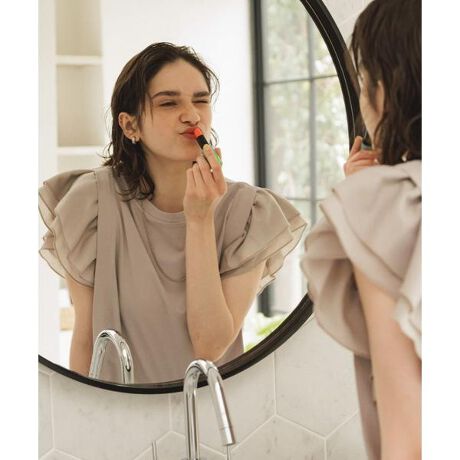 カットソー素材にフリルスリーブデザインがシンプルながら一枚でサマになる、大人カジュアルなトップス。