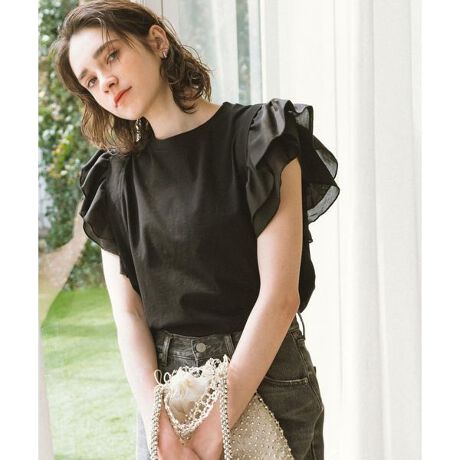 カットソー素材にフリルスリーブデザインがシンプルながら一枚でサマになる、大人カジュアルなトップス。