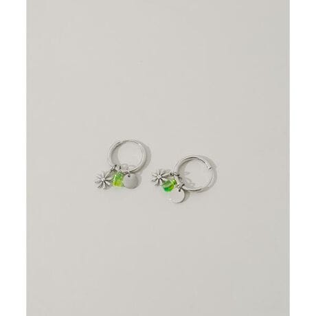シンプルなシルバーフープに、フラワー・グリーンビーズ・サークルプレートのチャームをあしらったピアス。
