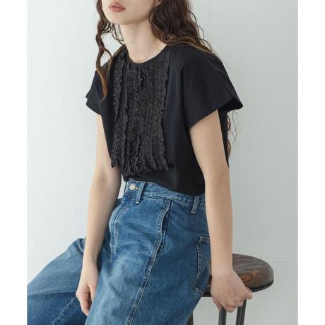 胸元の立体的なフリルデザインが特徴的な、シンプルなスタイリングに華やかさをプラスできるアイテムです。