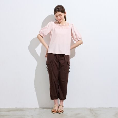 ・ボリューム袖と立体的なケミカルレースのフラワーモチーフで、シンプルになりがちな夏コーデも華やかに