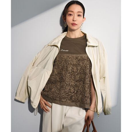 端境期の羽織りや、急な天候の変化にも頼れるナイロンジャケットです。スポーティーになりがちなナイロンアウターを、ゴールドのダブルジップやこだわりのディテールで、大人が着やすいラグジュアリーな雰囲気に仕上げました。襟元と裾にはドローストリングを施しており、絞ることでシルエットのアレンジが可能。襟元のドロストで顔周りにニュアンスのある抜け感を出し、裾を絞れば丸みのある女性らしいフォルムを楽しめます。ヒップが隠れる安心の着丈も嬉しいポイント。シワになりにくく軽量なので、バッグに入れて持ち運ぶのにも最適です。日焼け対策や冷房対策、レジャーシーンなど、日常のあらゆるシーンで活躍します。カラーは、明るく柔らかなベージュ(#033)、シックで合わせやすいダークブラウン(#035)の2色展開です。
