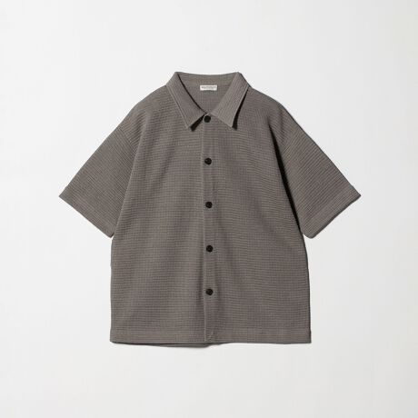 かぎ針ニットのような立体感と、ざっくりとした編み地をニットマシーンで表現し、シャツ仕立てで仕上げたニットシャツ。