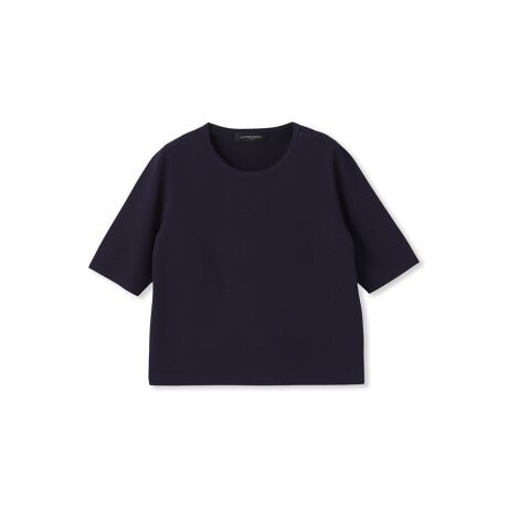 ミニマムなクルーネック、セットインスリーブの五分袖ニットです。