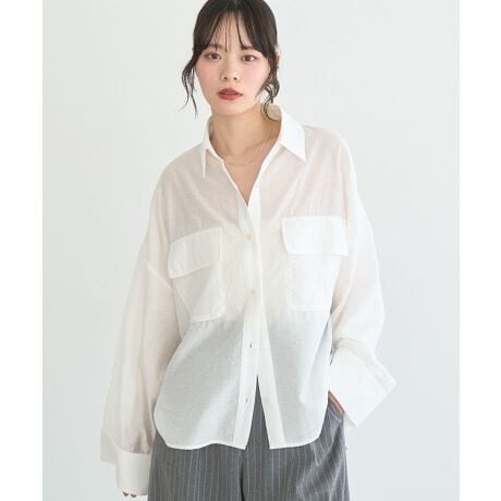 ほんのり透け感のある軽やかな素材が魅力のシャツです。やわらかなシアー感が女性らしい抜け感を演出し、コーディネートに優しい印象をプラスしてくれます。ゆったりとした袖ワイドデザインで動きやすく、リラックスした着心地も嬉しいポイントです。ダブルポケットが程よいアクセントになり、シンプルながらもこなれた雰囲気に仕上がります。一枚でさらっと着るのはもちろん、羽織りとしても活躍するため、季節の変わり目にも便利です。デイリーからお出かけまで幅広く使える万能アイテムです。