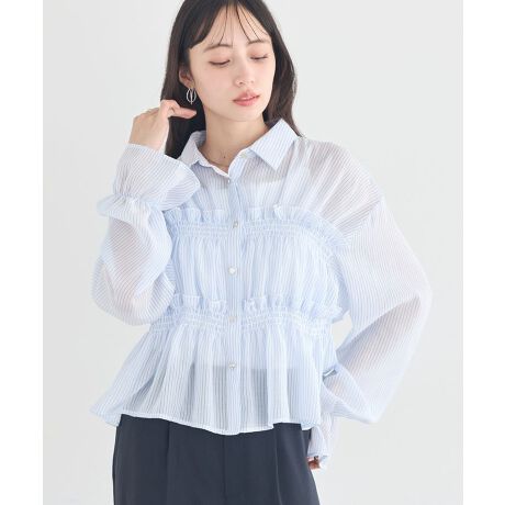軽やかに華やぐストライプシャツスタイル細やかなストライプ柄とシャーリングのディテールが印象的なシャツです。動くたびにふんわりと揺れるシルエットが、コーディネートに軽やかさと女性らしさを添えてくれます。透け感のある素材で重たくならず、春夏シーズンにも快適に着用できます。ゆとりのあるデザインで締め付け感がなく、リラックスしながらおしゃれを楽しめるのも魅力です。パンツにもスカートにも合わせやすく、一枚でコーディネートが決まる万能アイテムです。透け感[あり]
