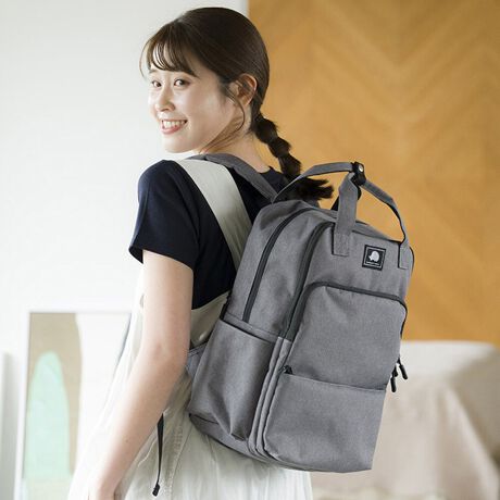 素材は厚手のポリエステルで、やわらかな雰囲気を醸し出す杢調(もくちょう)生地を使用 ハリがあって硬く、荷物が少ない日でもカタチが潰れにくく軽量だから普段使いしやすいリュックです。