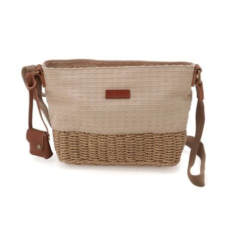 編み込んだペーパーと特徴のあるボーダー柄の生地を組み合わせています。