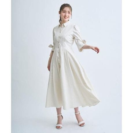 【袖リボンが可憐なきちんとフェミニンなストライプシャツワンピース】【Point】・袖口にあしらったリボンディテールが、コーディネートの主役になる大人可愛いアクセント。・縦ラインを強調するストライプ柄で、自然とスタイルアップが叶います。・きちんと感のあるシャツカラーに、女性らしいフレアシルエットを掛け合わせた上品デザイン。・ウエストは後ろゴム仕様で、程よくフィットしながら快適な着心地。・フロントボタン仕様で着脱しやすいところもうれしいポイント◎ケア方法:ドライクリーニング透け感:なし裏地:あり伸縮性:なし光沢感:なし生地の厚さ:薄手