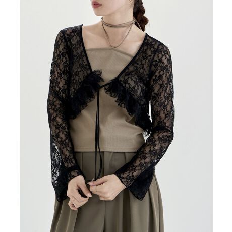 フリルやフレアスリーブの甘さでモード感が目にとまるレースボレロカーディガン。