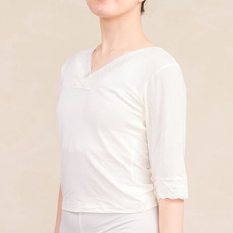 ストレッチ性の高い優れたフィット感の肌着は、ヘアスタイルに配慮し足からの着脱可能なように襟元を広く開けました。