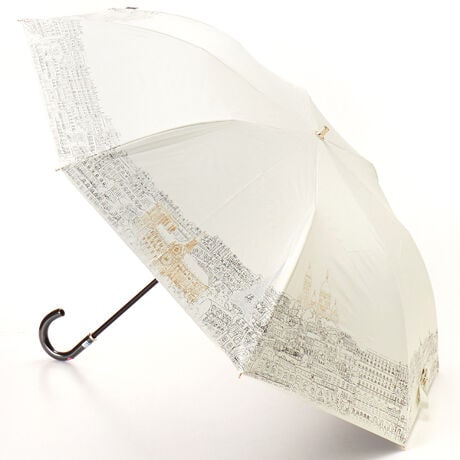 パリの街並みをスケッチしたデザインが映える晴雨兼用傘。シルバーとゴールドのパールプリントがアクセントとなり、上品なきらめきを添えます。遮光率・UVカット100%の高機能仕様に加え、親骨55cmの大きめサイズで、強い日差しからしっかりと守ります。