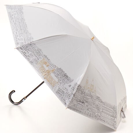 パリの街並みをスケッチしたデザインが映える晴雨兼用傘。シルバーとゴールドのパールプリントがアクセントとなり、上品なきらめきを添えます。遮光率・UVカット100%の高機能仕様に加え、親骨55cmの大きめサイズで、強い日差しからしっかりと守ります。