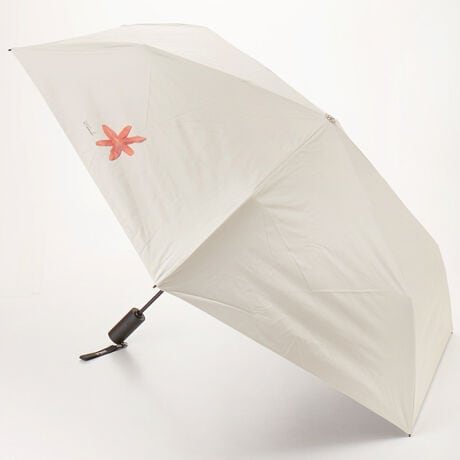 ボタン一つで開閉できる『らくジャン!』搭載の自動開閉タイプの晴雨兼用傘。花やフルーツの写実的なプリントに、“I love flower”の手書き文字刺しゅうが映えるデザインです。持ち手付きのセミワイド袋で出し入れしやすく、遮光率・UVカット100%の高機能仕様に加え、親骨55cmの大きめサイズで強い日差しをしっかりとガードします。