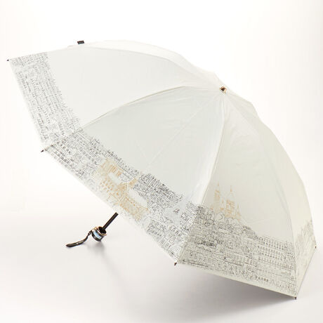 パリの街並みをスケッチしたデザインが映える晴雨兼用傘。シルバーとゴールドのパールプリントがアクセントとなり、上品なきらめきを添えます。遮光率・UVカット100%の高機能仕様に加え、親骨55cmの大きめサイズで、強い日差しからしっかりと守ります。