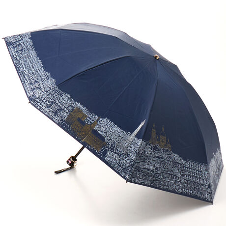 パリの街並みをスケッチしたデザインが映える晴雨兼用傘。シルバーとゴールドのパールプリントがアクセントとなり、上品なきらめきを添えます。遮光率・UVカット100%の高機能仕様に加え、親骨55cmの大きめサイズで、強い日差しからしっかりと守ります。