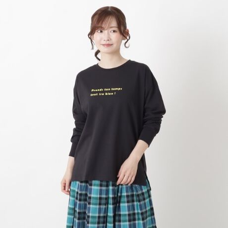 アクセントになるロゴプリントカラーが、コーディネートのポイントに。